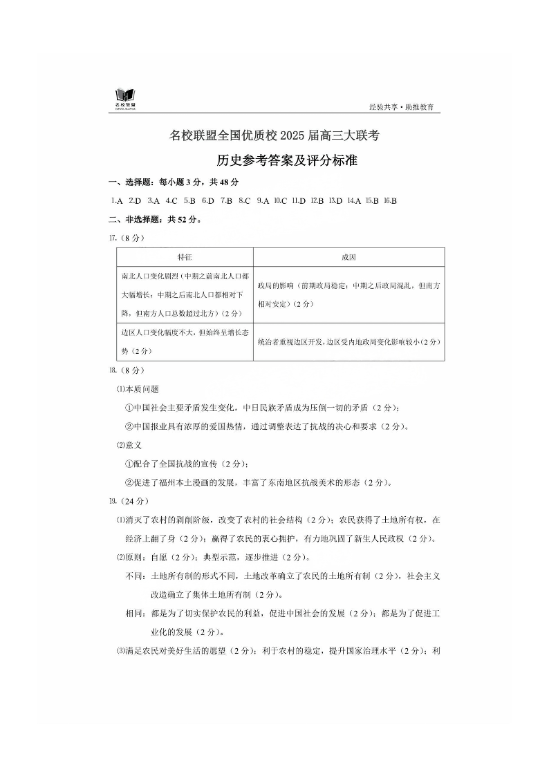 福建省名校联盟优质校2024-2025学年下学期2月高三联考历史答案