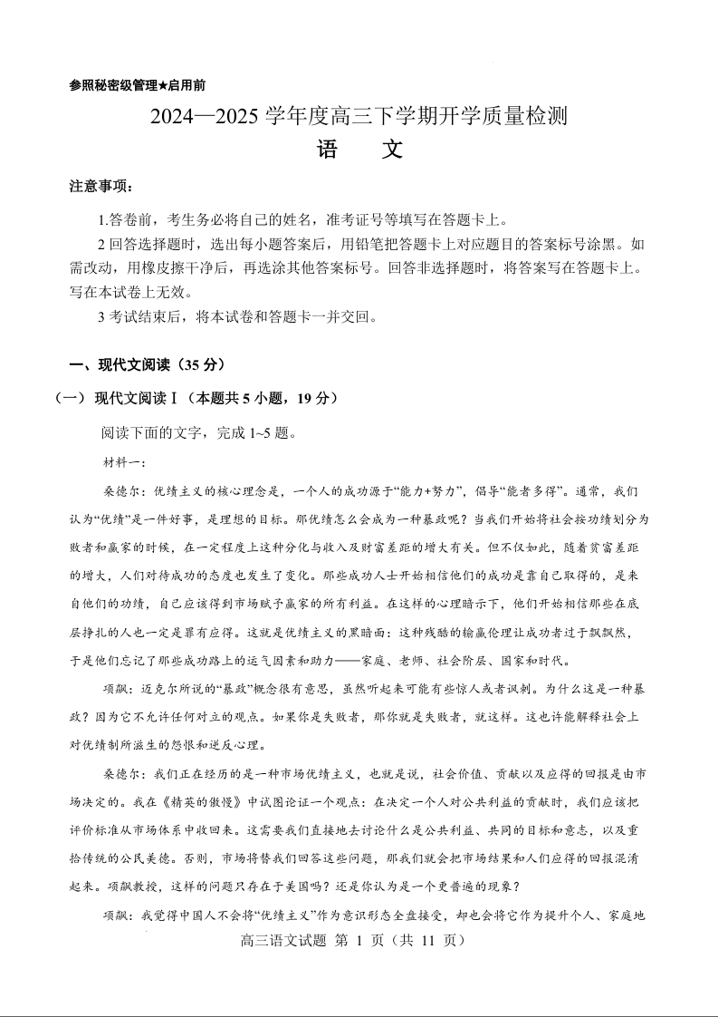 山东省淄博实验中学2024-2025学年下学期高三开学考试语文
