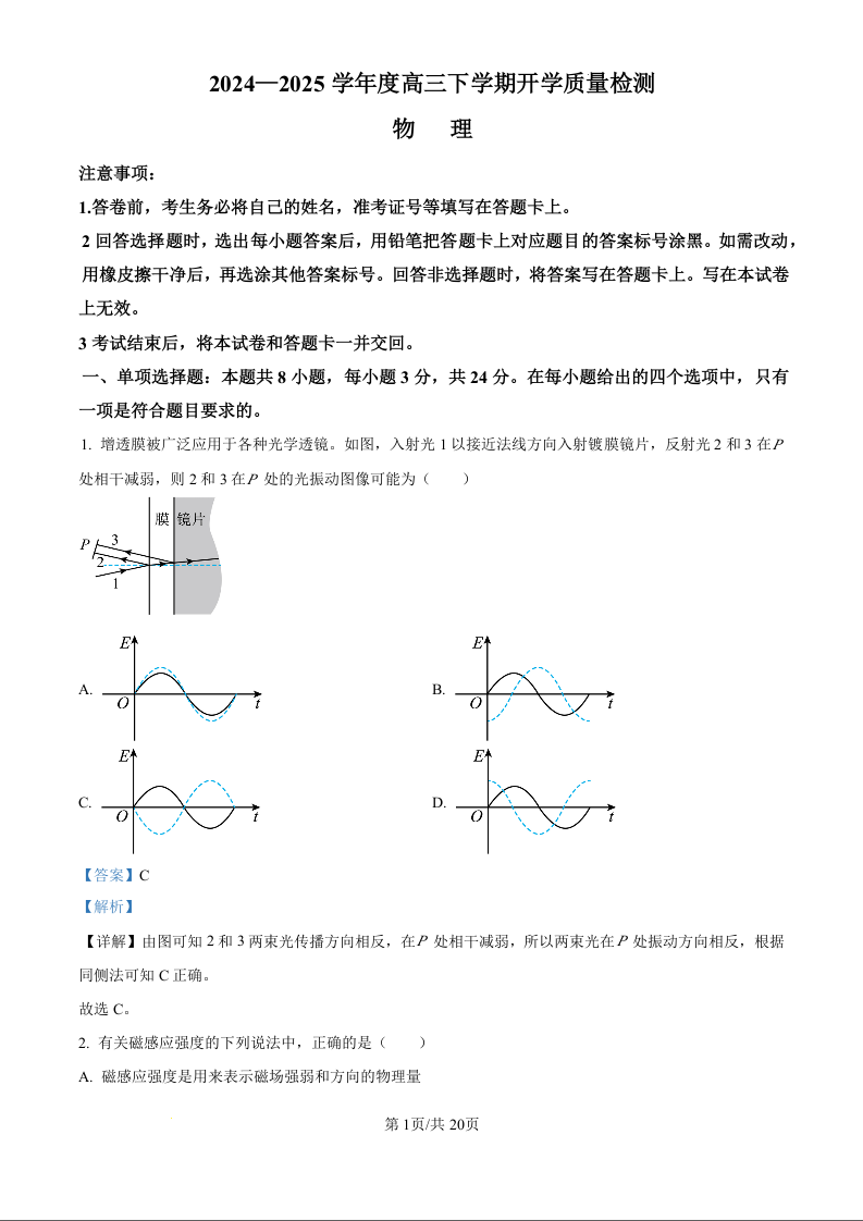 山东省淄博实验中学2024-2025学年下学期高三开学考试物理(精品解析版)