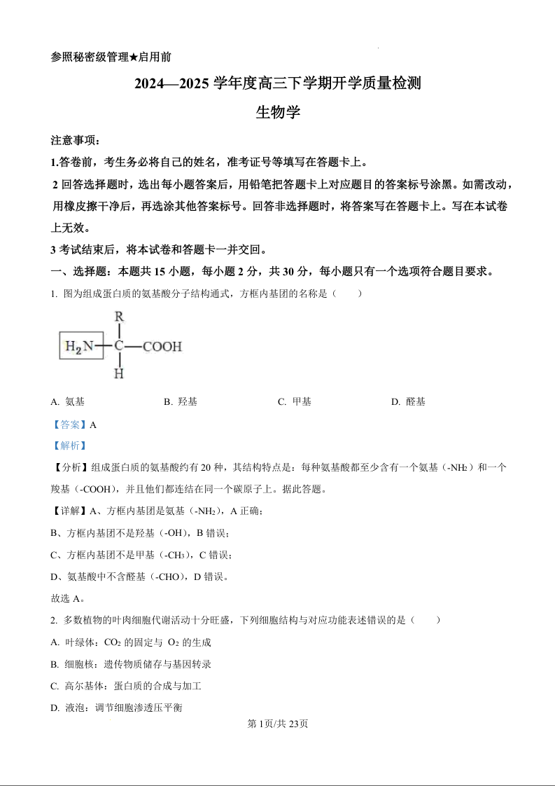 山东省淄博实验中学2024-2025学年下学期高三开学考试生物(精品解析版)