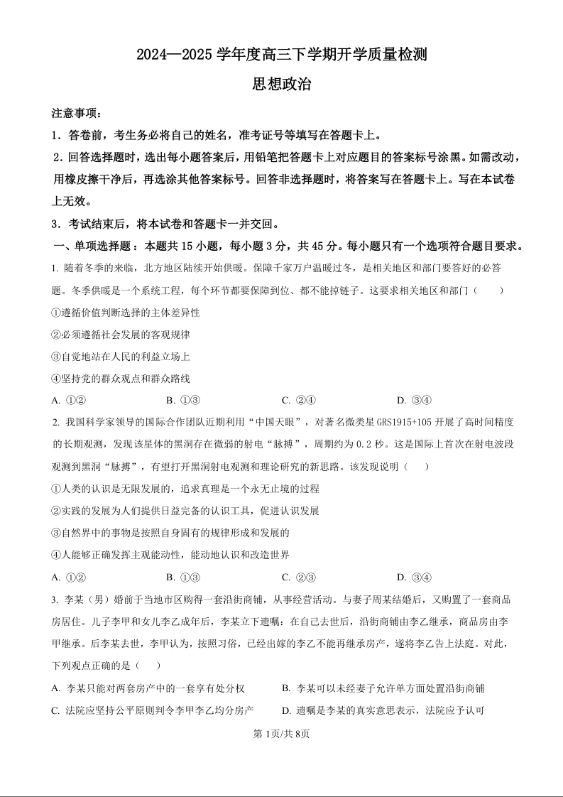 山东省淄博实验中学2024-2025学年下学期高三开学考试政治(原卷版)
