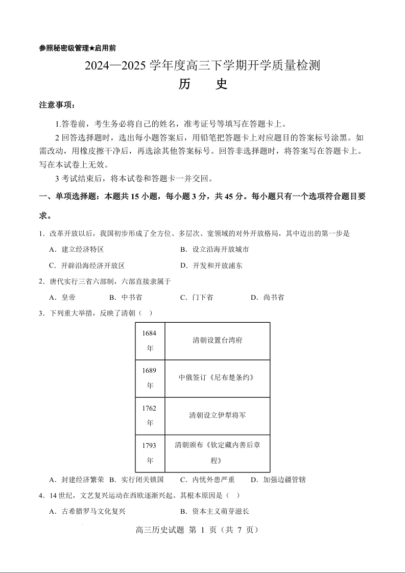 山东省淄博实验中学2024-2025学年下学期高三开学考试历史