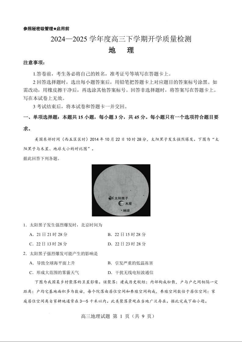 山东省淄博实验中学2024-2025学年下学期高三开学考试地理