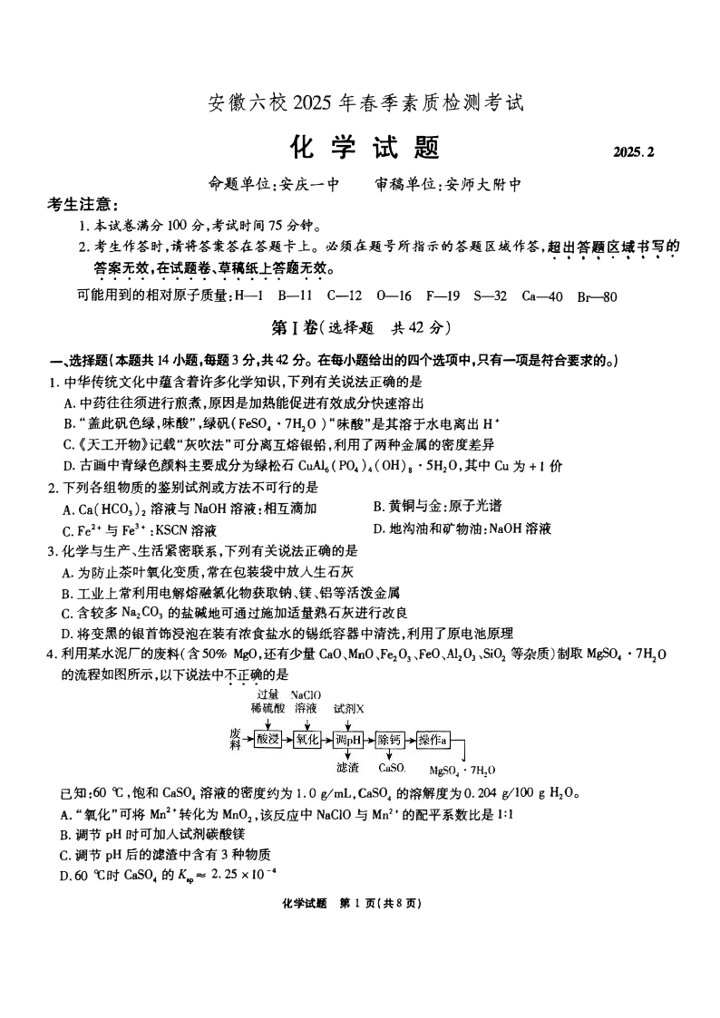 安徽省六校2024-2025学年下学期2月高三素质检测考试化学