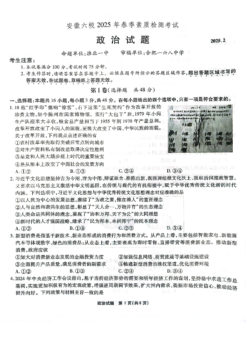安徽省六校2024-2025学年下学期2月高三素质检测考试政治