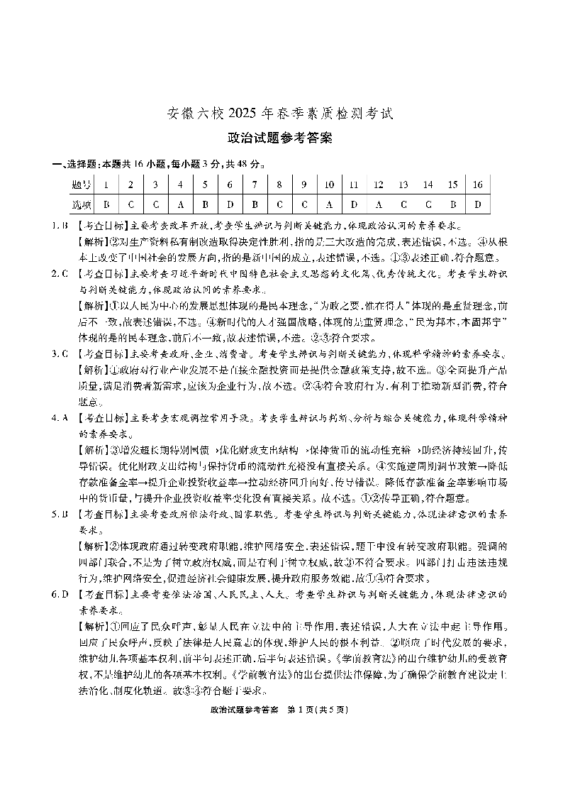 安徽省六校2024-2025学年下学期2月高三素质检测考试政治答案