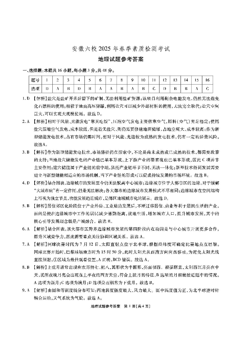 安徽省六校2024-2025学年下学期2月高三素质检测考试地理答案