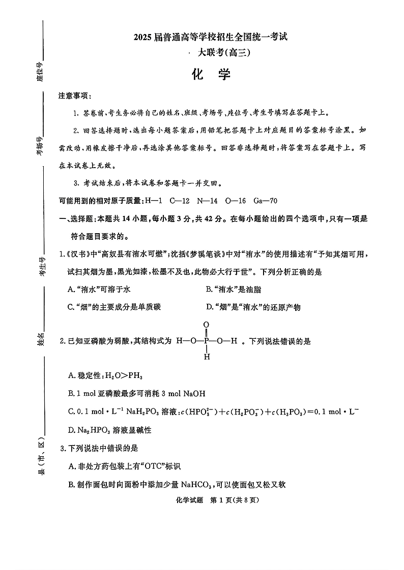 河南省部分高中2024-2025学年下学期2月高三联考化学+答案