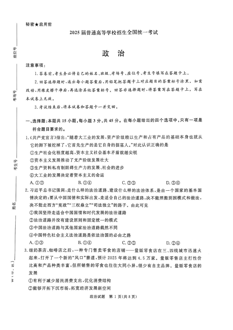 河南省部分高中2024-2025学年下学期2月高三联考政治+答案