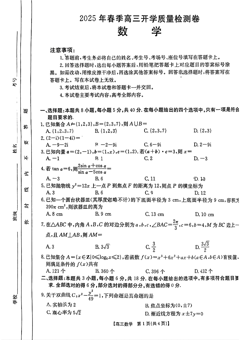 广西壮族自治区桂林市2024-2025春季高三开学质量检测数学