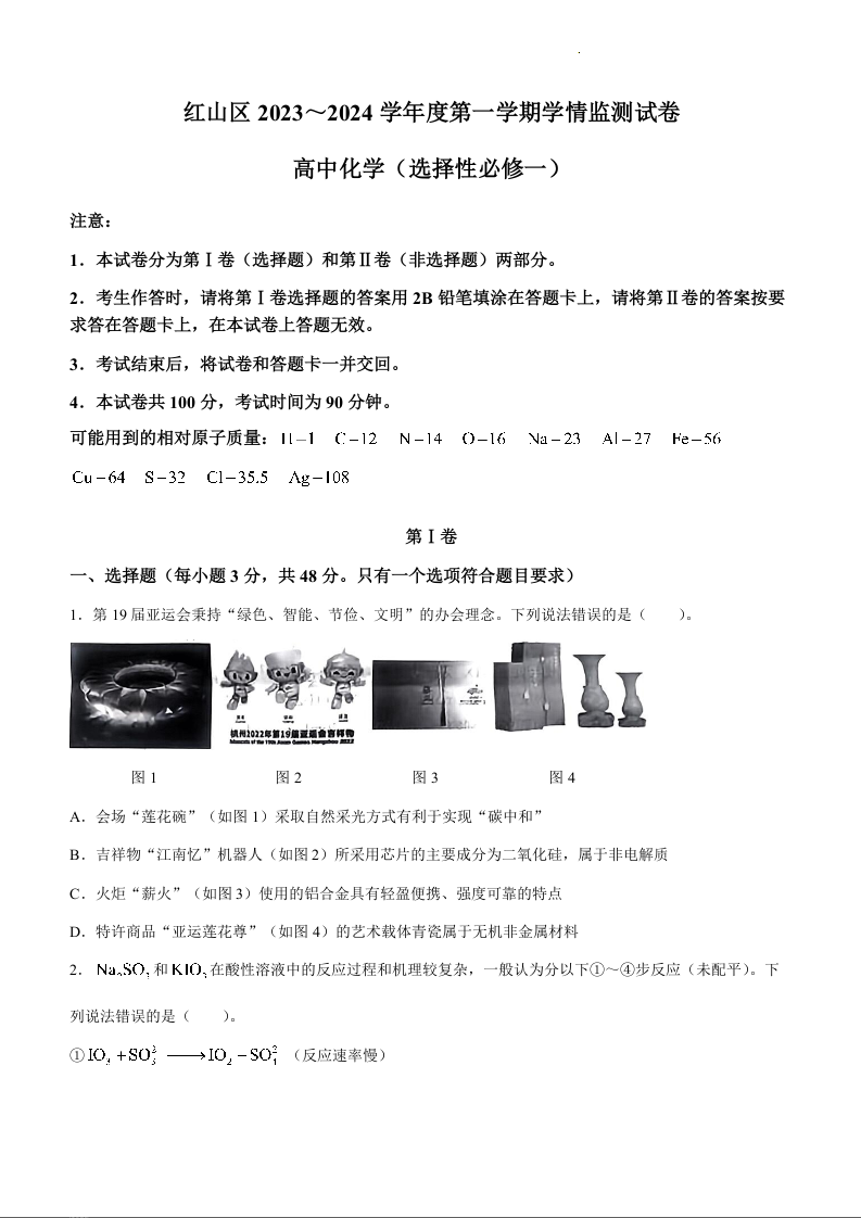 内蒙古赤峰市红山区2023-2024学年高二上学期1月期末考试化学+答案
