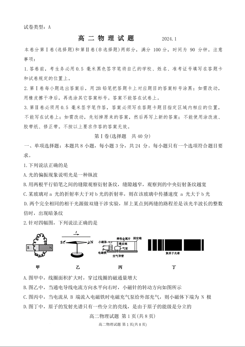 山东省滨州市2023-2024学年高二上学期1月期末考试物理