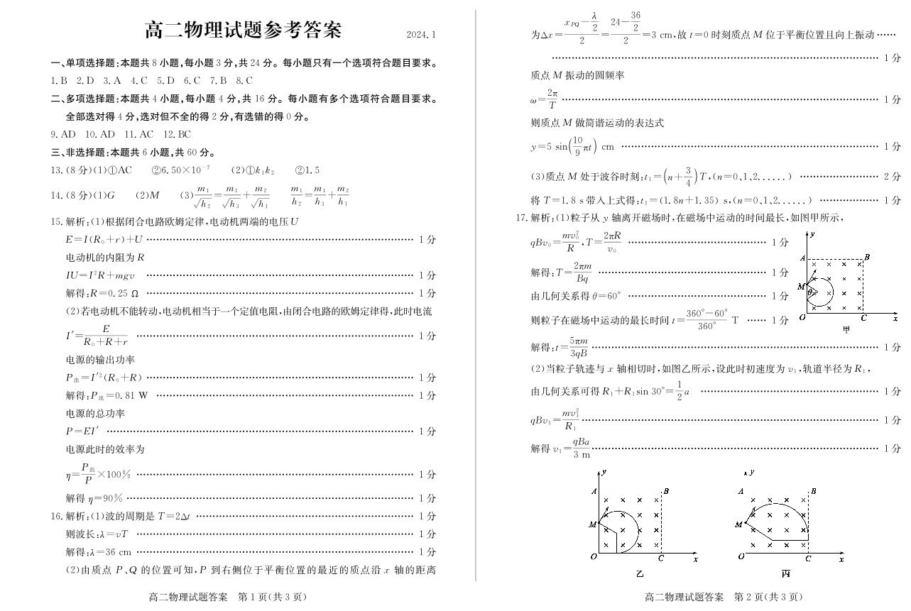 山东省滨州市2023-2024学年高二上学期1月期末考试物理答案