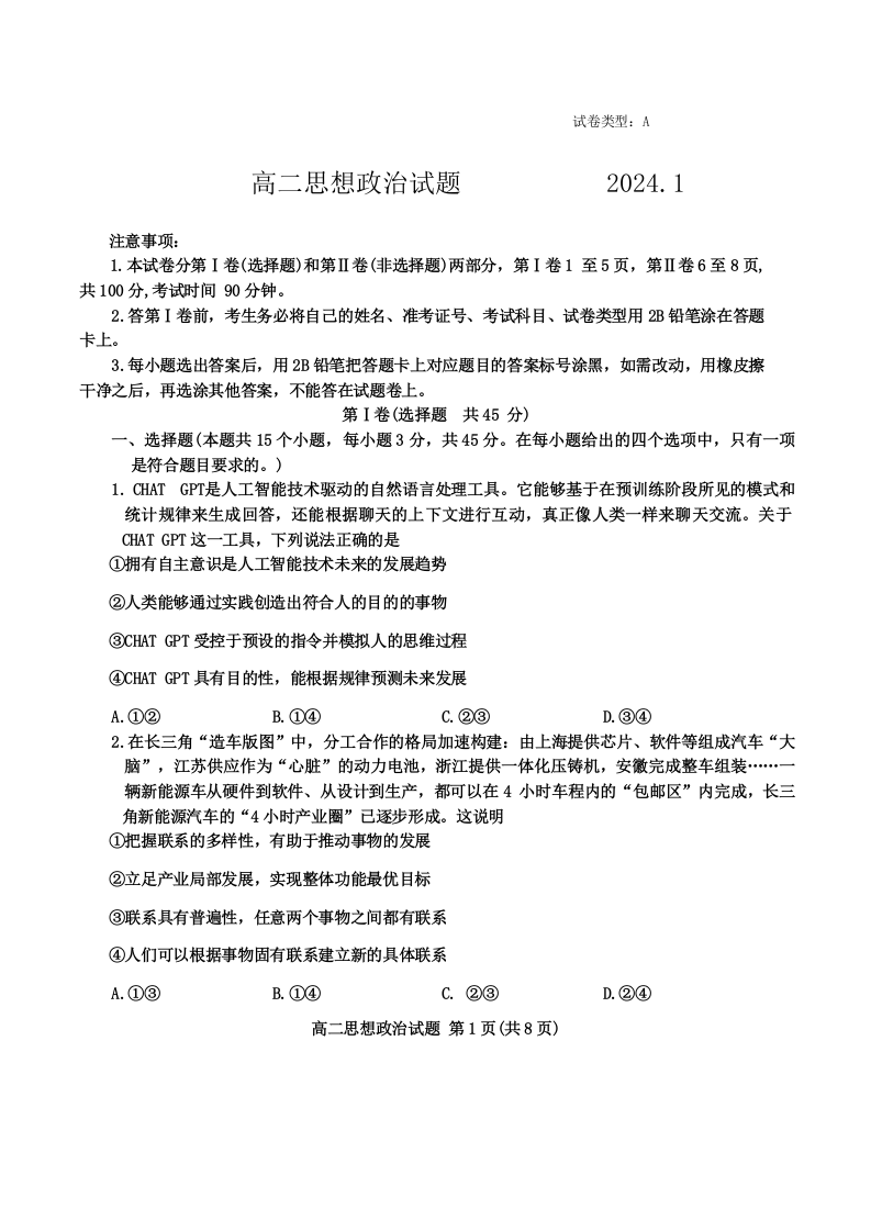 山东省滨州市2023-2024学年高二上学期1月期末考试政治