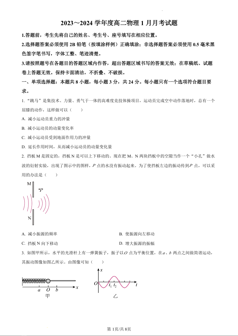 山东省威海市乳山市银滩高级中学2023-2024学年高二上学期1月考试物理(原卷版)