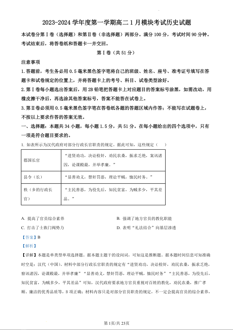山东省威海市乳山市银滩高级中学2023-2024学年高二上学期1月考试历史(精品解析版)
