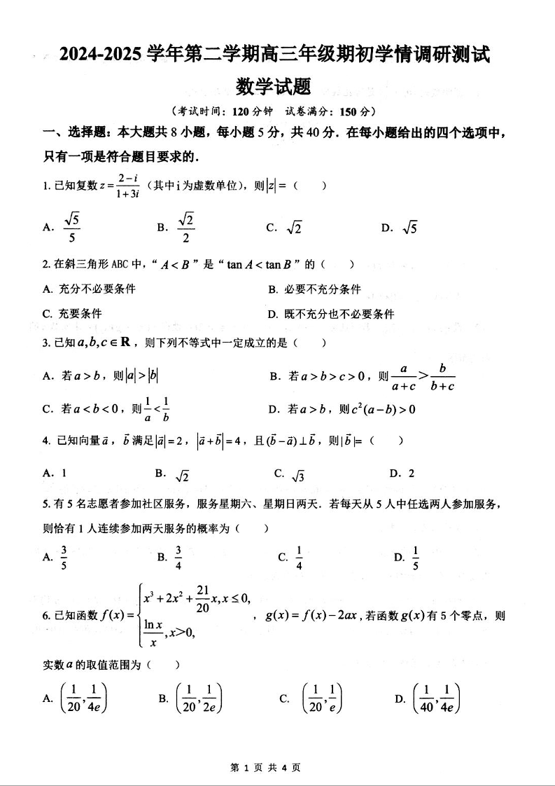 江苏省扬州市高邮市2024-2025学年下学期高三开学考试数学+答案