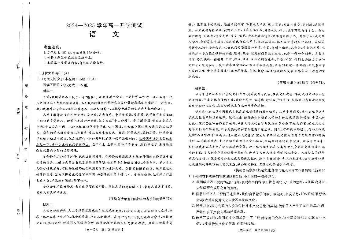 河南省区域高中2024-2025学年下学期高一开学考试语文