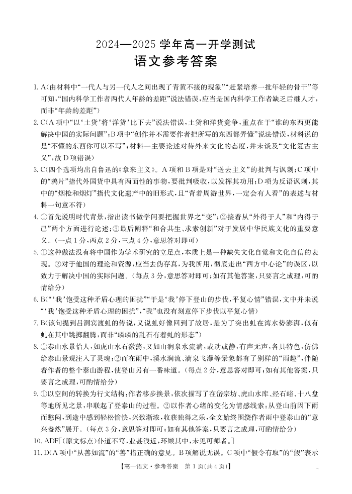 河南省区域高中2024-2025学年下学期高一开学考试语文答案