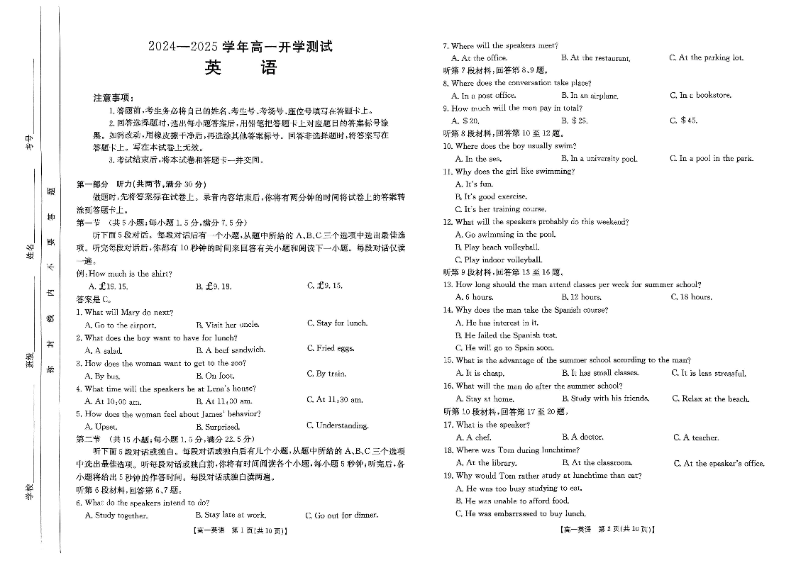 河南省区域高中2024-2025学年下学期高一开学考试英语