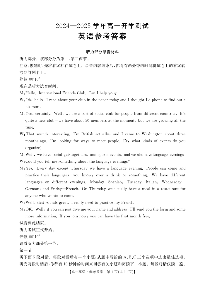 河南省区域高中2024-2025学年下学期高一开学考试英语答案
