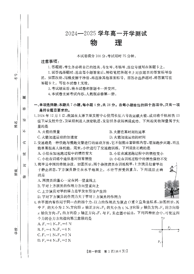 河南省区域高中2024-2025学年下学期高一开学考试物理