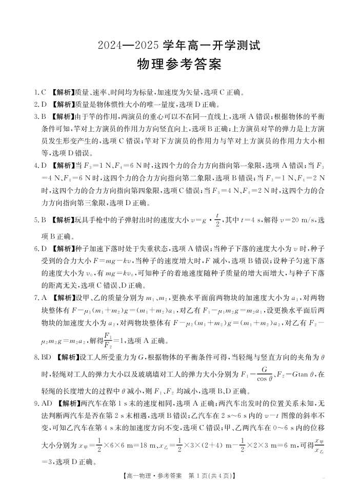 河南省区域高中2024-2025学年下学期高一开学考试物理答案