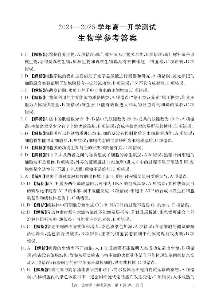河南省区域高中2024-2025学年下学期高一开学考试生物学答案
