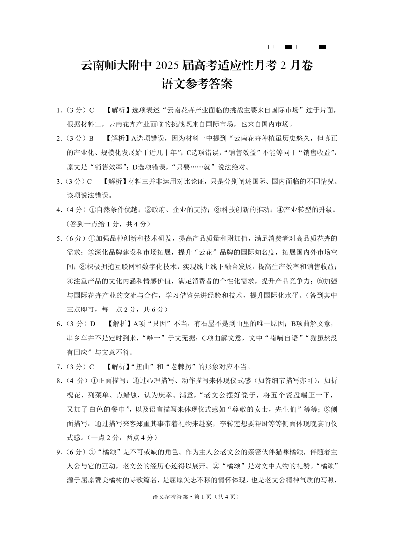 云南省师大学附中2024-2025学年下学期高三开学考试语文答案