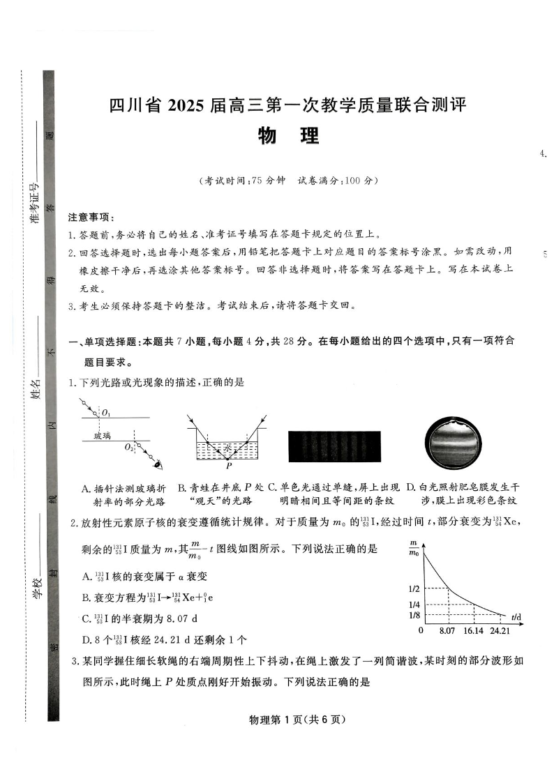 四川省2024-2025学年下学期2月高三第一次教学质量联合测评物理+答案