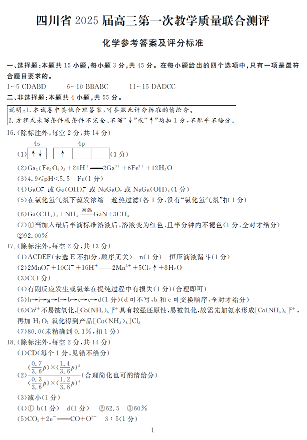 四川省2024-2025学年下学期2月高三第一次教学质量联合测评化学