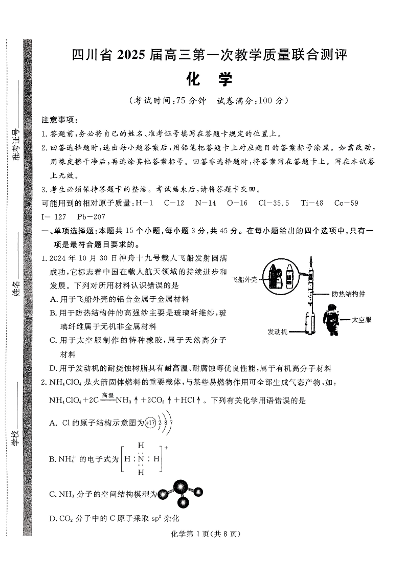 四川省2024-2025学年下学期2月高三第一次教学质量联合测评化学答案