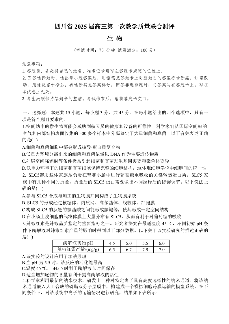 四川省2024-2025学年下学期2月高三第一次教学质量联合测评生物+答案