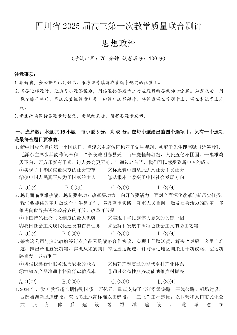 四川省2024-2025学年下学期2月高三第一次教学质量联合测评政治+答案