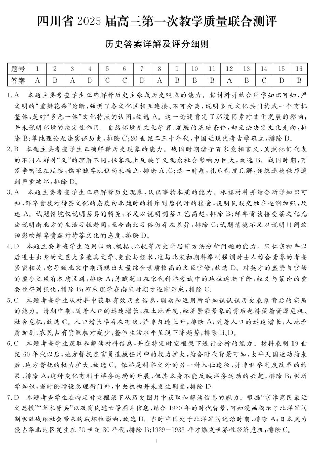 四川省2024-2025学年下学期2月高三第一次教学质量联合测评历史答案