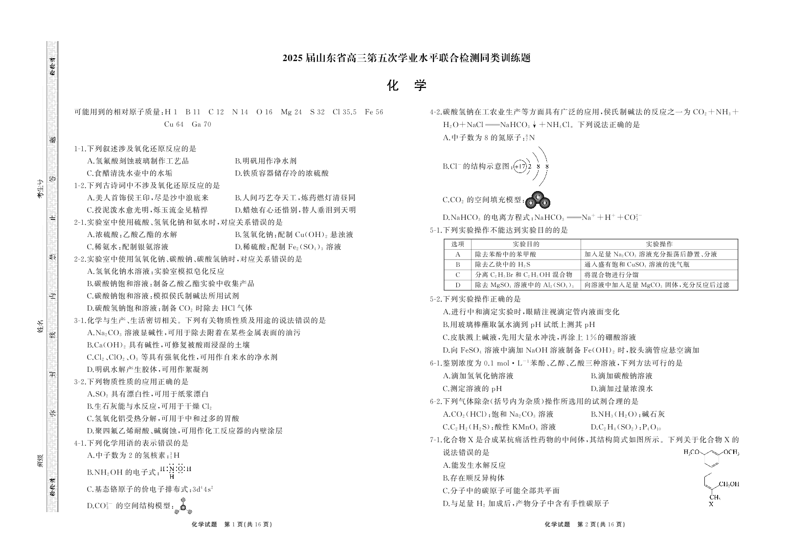 山东省齐鲁名校联考2024-2025学年下学期高三联合检测(五)化学