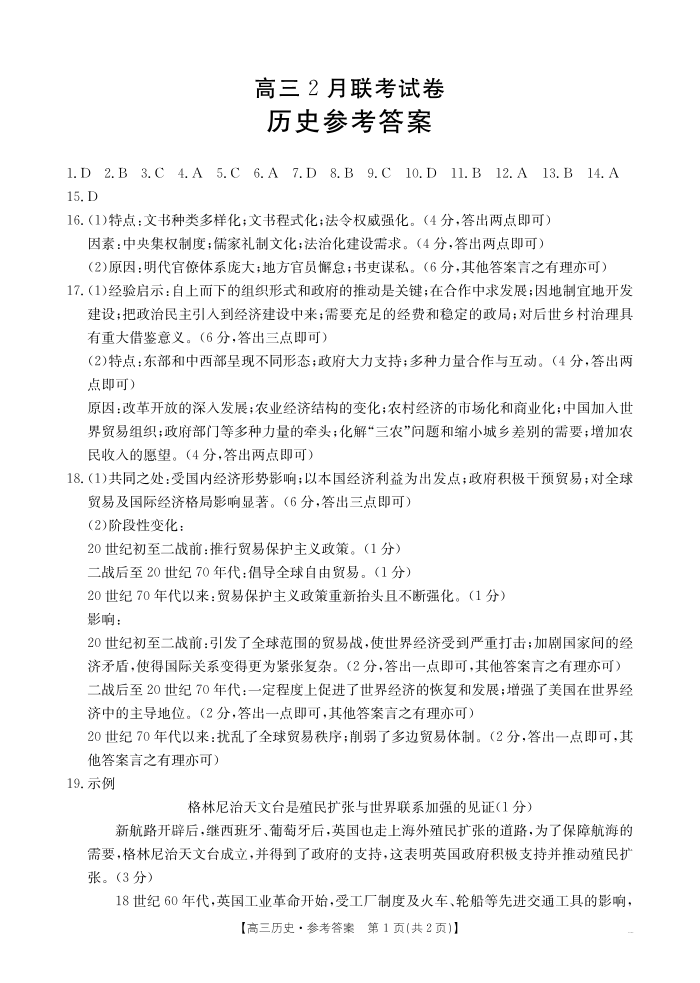 湖北省鄂东新领先协作体2024-2025学年下学期2月高三调考历史答案