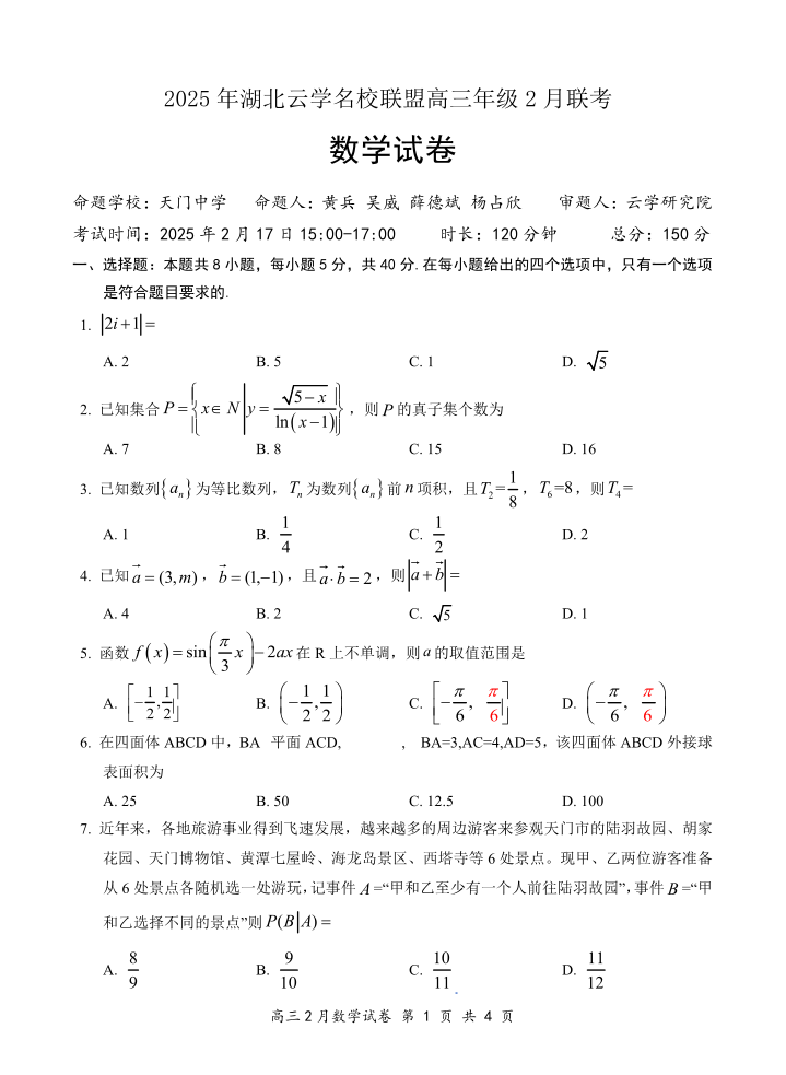 湖北省云学名校联盟2024-2025学年下学期2月高三联考数学