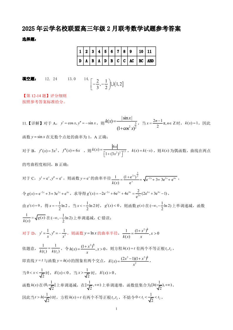 湖北省云学名校联盟2024-2025学年下学期2月高三联考数学答案