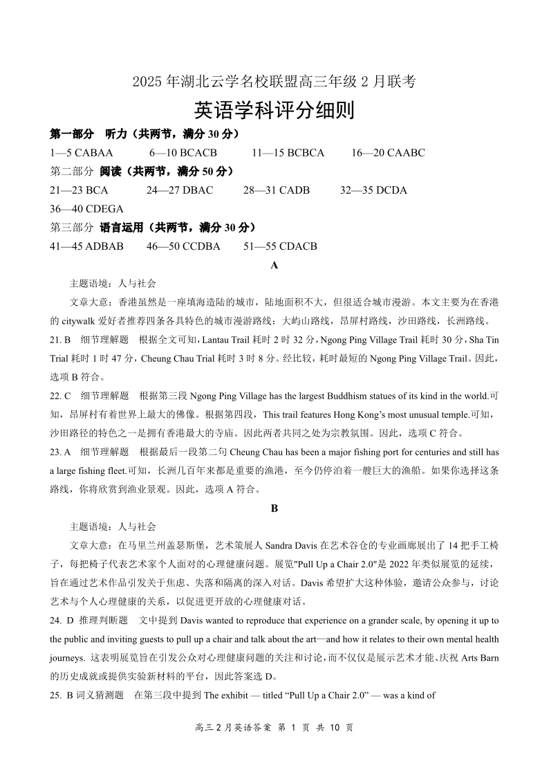 湖北省云学名校联盟2024-2025学年下学期2月高三联考英语答案