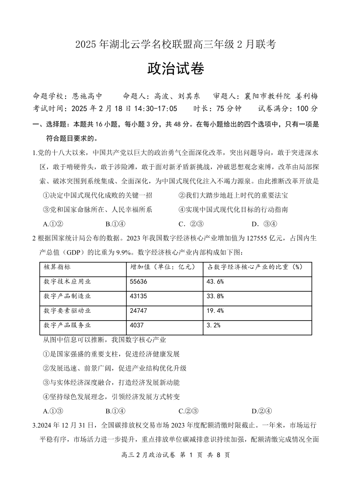 湖北省云学名校联盟2024-2025学年下学期2月高三联考政治