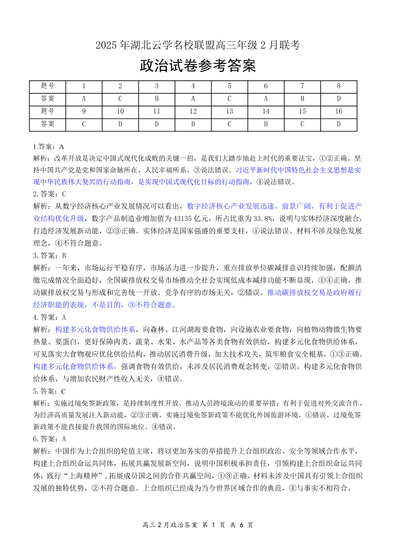 湖北省云学名校联盟2024-2025学年下学期2月高三联考政治答案