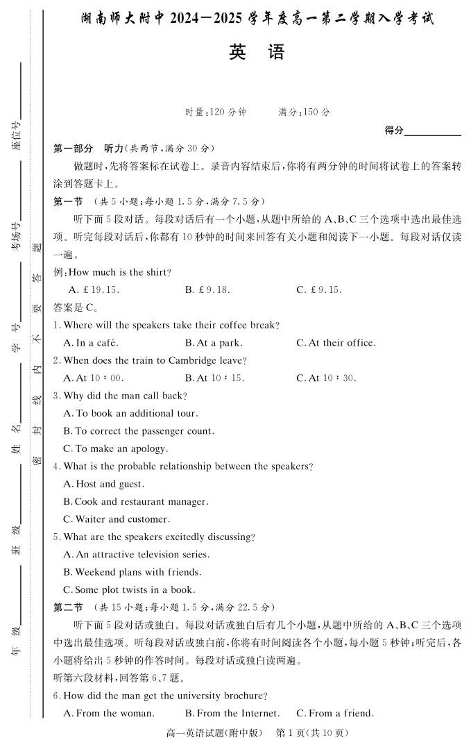 湖南省师范大学附属中学2024-2025学年高一下学期入学考试英语