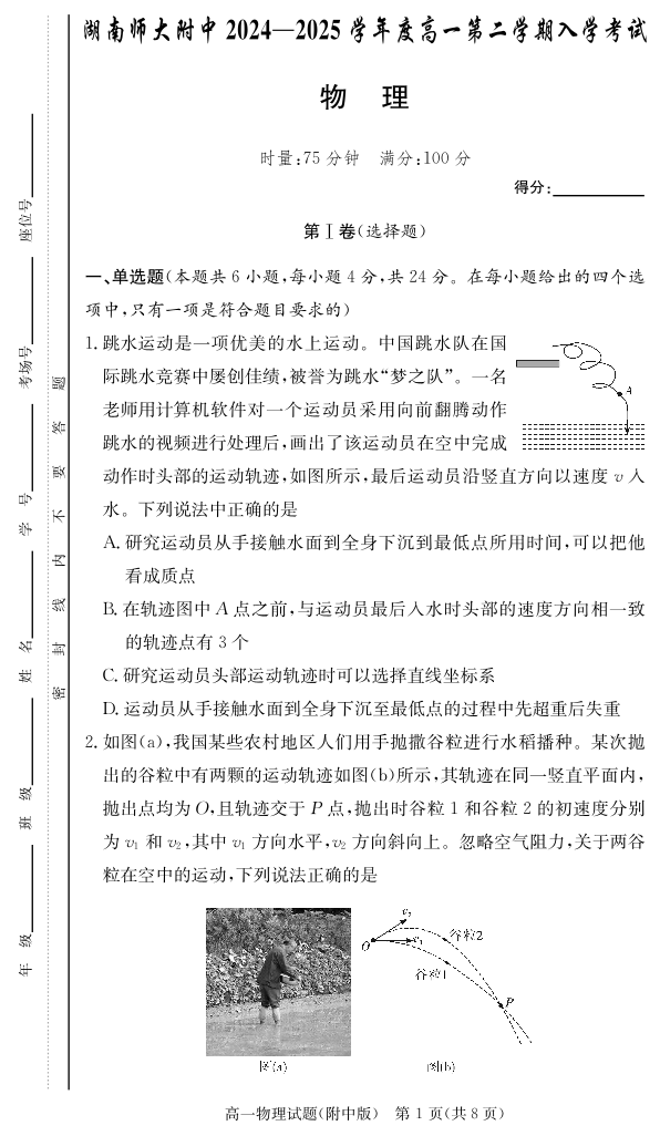 湖南省师范大学附属中学2024-2025学年高一下学期入学考试物理