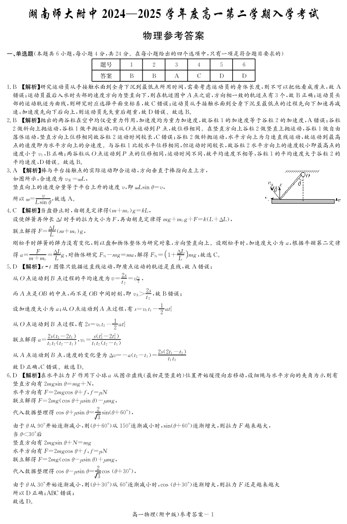 湖南省师范大学附属中学2024-2025学年高一下学期入学考试物理答案