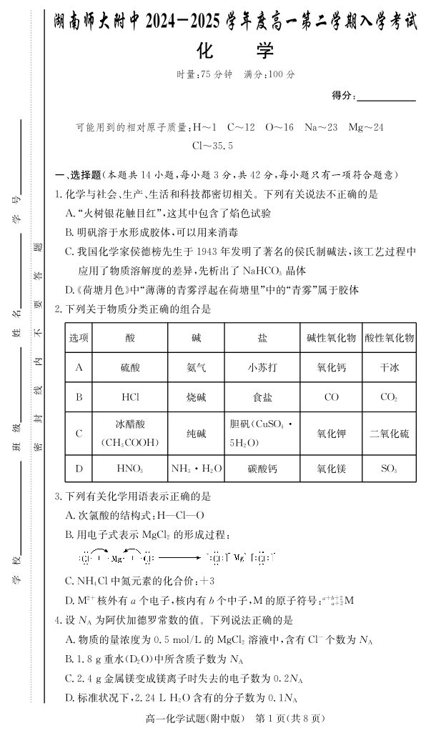 湖南省师范大学附属中学2024-2025学年高一下学期入学考试化学