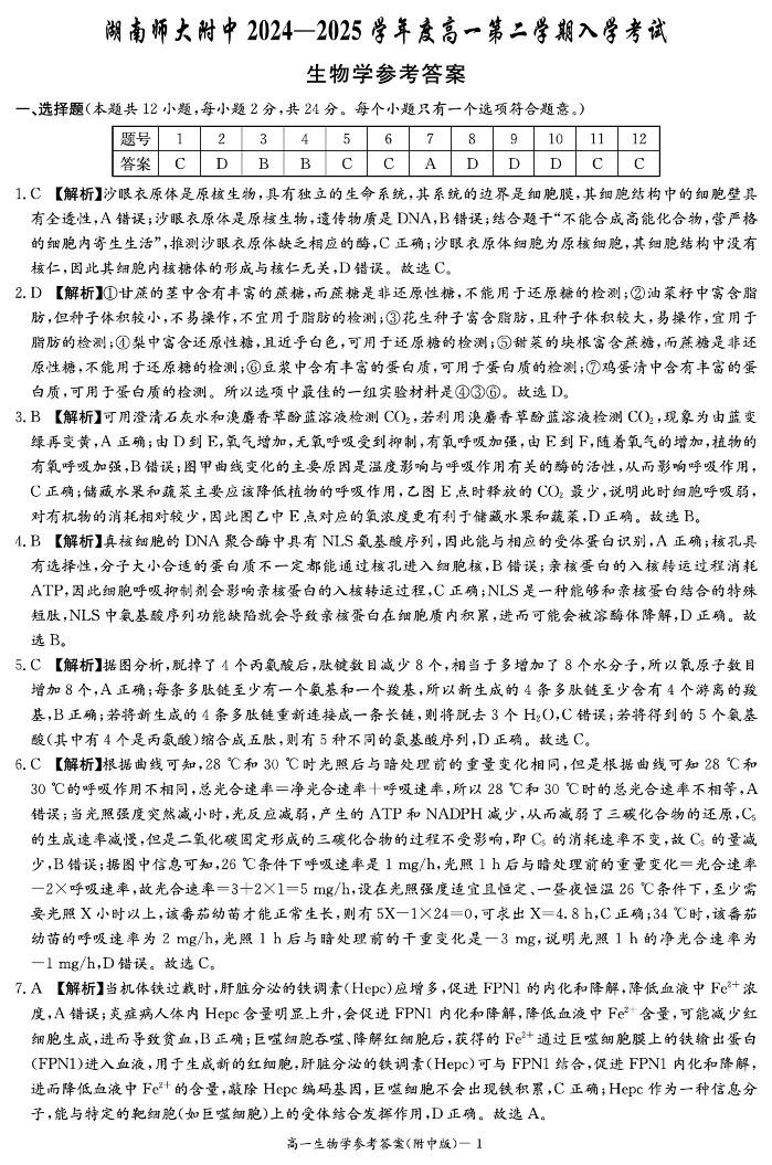 湖南省师范大学附属中学2024-2025学年高一下学期入学考试生物答案