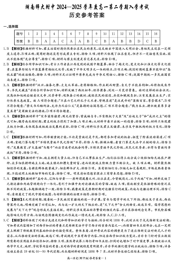 湖南省师范大学附属中学2024-2025学年高一下学期入学考试历史答案
