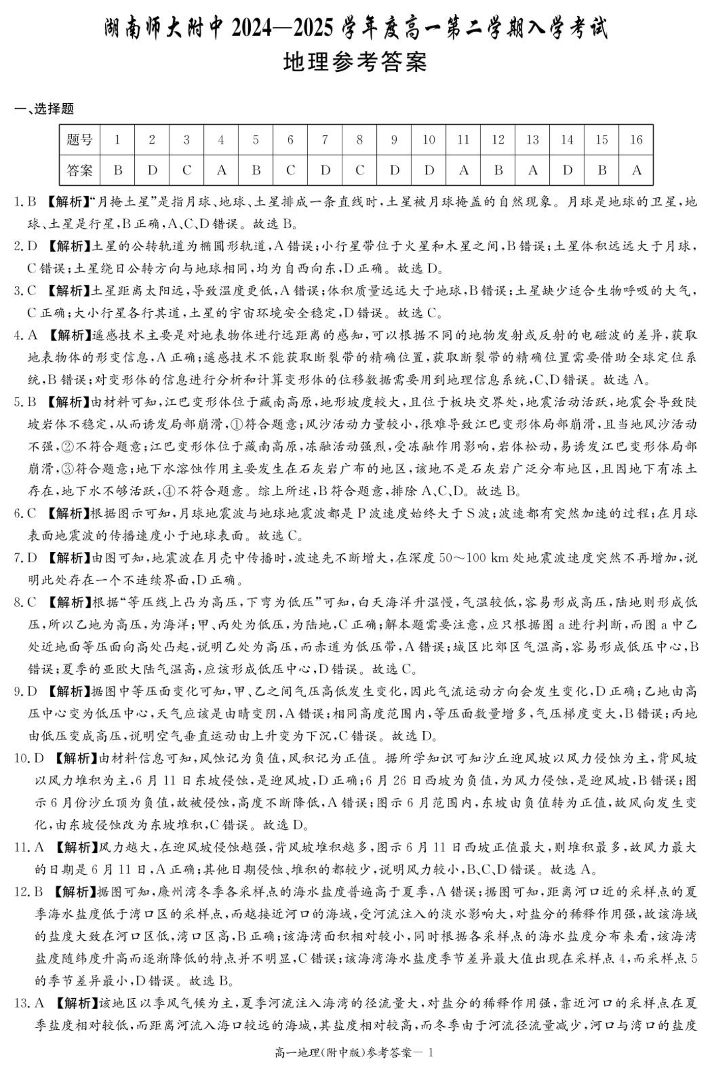 湖南省师范大学附属中学2024-2025学年高一下学期入学考试地理答案