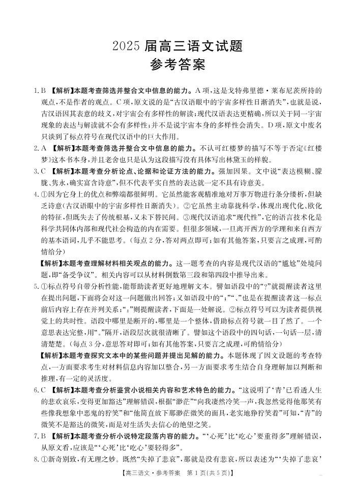 四川省部分学校2024-2025学年下学期2月高三开学考试语文答案
